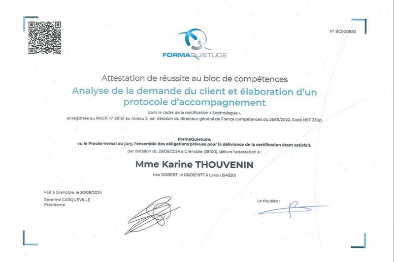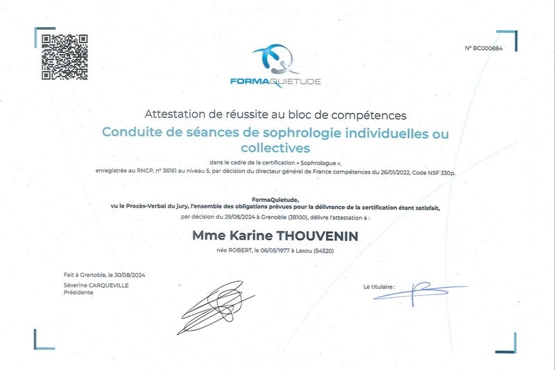 Karine THOUVENIN, je suis mariée et j’ai 2 enfants. Je travaille dans une grande entreprise dans laquelle j’ai évolué depuis plus de 29 ans. En 2024, j’ai décidé d’entreprendre une formation en sophrologie. Les métiers du bien-être m’ont toujours attiré, je suis une personne emphatique, bienveillante, qui aime le relationnel, le contact avec les personnes et je souhaite apporter mon aide aux gens dans un domaine d’activité qui me correspond davantage. Pour le moment, je propose des séances de sophrologie en complément d’activité puis par la suite, j’envisage de m’y consacrer à plein temps.